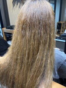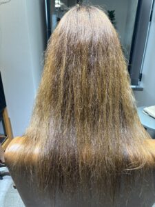 ハイトーンカラーやブリーチをしている髪は、パサつきや広がり、うねりが出やすく、通常の縮毛矯正では硬さや不自然さが残りがちです。