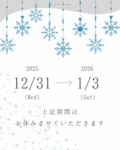 12/31(水)〜1/3(土)は休業いたします。【rire hair千早店は1/4(日)まで休業となります】